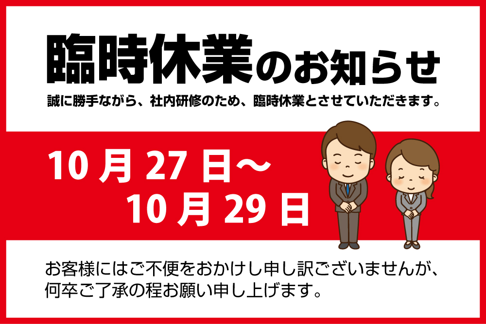 誠に勝手ながら、下記の期間社内研修のため臨時休業とさせていただきます。