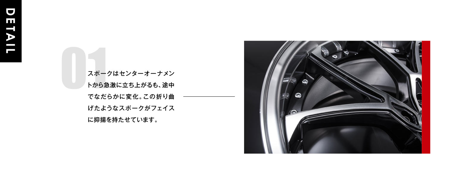 スリムスポークを繊細に、かつ大胆に。プレミアム感を意匠全体から放つ、一本。FORGED DESIGN 333 フォージド デザイン サン・サン・サン 5本スポークを基本に、途中から2本のスポークへ変化。いわゆる、デュアルスポークと呼ばれる意匠を採用する、フォージドデザイン333。これによりリムに接合するスポーク本数は10本に。見た目にはとてもスリムなスポークデザインを完成させました。また、そのスポークは、2股に分岐するところから折り曲げるように、リムへと沈み込みます。表情に抑揚を与えるこの技法により、フェイスに奥行き感と躍動感を演出。スポークは細身だけど、力強さが伝わってくるそこには、このスポークデザインのギミックが大きく貢献します。結果、その繊細さや躍動感が、プレミアムなオーラを放つことに。 似て非なる、2バリエーションのカラー設定。COLOR ブラック/ポリッシュ この333には、ブラック/ポリッシュとマシニング/ブラックの2色を設定します。この2色、ブラックとポリッシュorマシニングという、組み合わせはほぼ同じ色目。しかしながら、ブラック/ポリッシュは、スポークの天面がポリッシュ加工で、その側面がブラック。対して、マシニング/ポリッシュは、スポークの天面がブラックで、その側面がマシニング加工。つまり、色の差し方を反転させた、仕様違いというわけです。この反転したカラーによって、フンイキもガラリと変化。その違いは、装着の写真を見ても、一目瞭然です。COLOR マシニング/ブラック DETAIL 01 スポークはセンターオーナメントから急激に立ち上がるも、途中でなだらかに変化。この折り曲げたようなスポークがフェイスに抑揚を持たせています。 02 スポークのフチには一段落とし込みを設け、配色を変える仕掛けを採用。よりスポークをスリムにみせるギミックのひとつです。 03 デュアルスポークを採用する333。繊細に、しかし大胆に仕立てたこのスポークの印象により、おのずとプレミアムなオーラを漂わせます。 04 ホールの形状までも単調に丸型にするのではなく、工夫を凝らすのがエムズスピード流儀。天面の見え方が、デュアルスポーク部分とのデザイン連動を意識させます。 05 リムにあしらわれるピアスボルトがマルチピースホイールであることを、静かにアピールします。333は鍛造製2ピースモデル。 06 このディスクは、マシニング/ブラック。スポーク側面のマシニングならではの切削処理が、より高級感をアップさせます。素材感の魅せヂカラは、やはり別格。 MATCHING ラグジュアリーにも、スポーティにもフレル、懐の深さも魅力的。