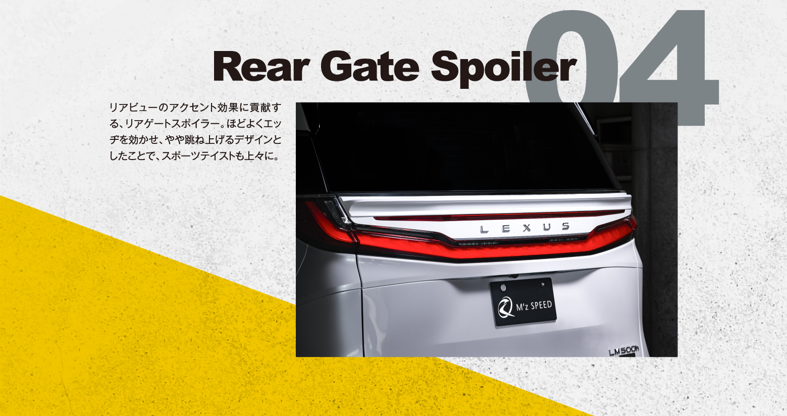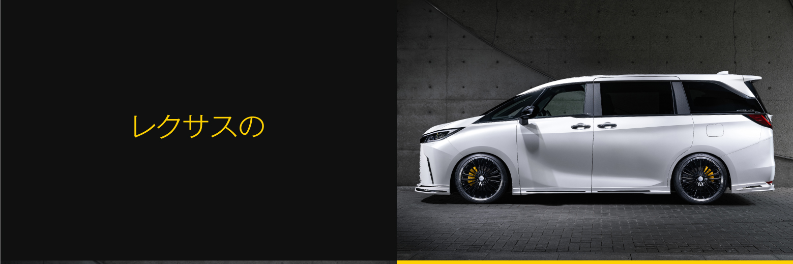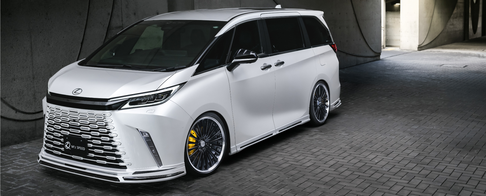 EXCLUSIVE ZEUS GRACE LINE LEXUS LM LEXUS LM Front Left Side Image さりげなくも、確かな個性を植え付けるギミック。 言うまでもなく、ミニバン界のトップ・オブ・ラグジュアリーな一台、レクサスLM。レクサスのブランディングに相応しいプレミアムなその風格は一目を置く存在だ。このレクサスLMにエムズスピードが用意したカスタムメニューは大人的なギミックを採用したボディキット。ミニバン専用のエアロシリーズ、GRACE LINE(グレースライン)のプロデュースとなります。 パーツ構成はフロントハーフスポイラー、サイドステップ、リアアンダースポイラー、フロントグリルガーニッシュ、リアゲートスポイラー、ドアミラーカバー、ピラーパネルと、アイテムは多数。なんといっても最大のトピックは、ボトム3点のスポイラーに仕込んだ純正のメッキ加飾をエアロから覗かせるというギミック。一見シンプルなルックですが、このメッキ加飾をさらに際立たせる効果的な演出。これぞレクサスの世界観をキープしつつも、しっかりと見せ場を作った大人なエアロカスタムです。 LEXUS LM Rear Right Side Image 基本は薄型設計で レクサスの プレミアムな風格はキープ。 01 Front Half Spoiler: 純正バンパーのボトムまわりの段付き形状をプレーンに補正する形状を採用する、フロントハーフスポイラー。加えて、下方向へ46mm拡大したサイズ感で、プチ整形。少し厚みを増したフェイスは存在感も確実にアップ。 DETAIL エアロにダクトを設け、そのダクトから純正のメッキ加飾が覗くようなギミックを採用。フェイス正面のメッキ部分もしっかりと見せる仕立て。 中央に走る横長ダクト風のプレスには、ほんのさりげなくフィンを通してディフューザーライクに。デモカーのように塗り分け塗装を施せば、さらにその効果は倍増。 02 Side Step: サイドステップにもスリットダクトを採用し、メッキ加飾見せ。サイズ感はそれほど大きくはないものの、リブを設けることで抑揚のあるルックスに仕上がりました。 03 Rear Under Spoiler: フロントと同様にサイズ感はコンパクトながら、ディフューザーやデザインプレスを効果的に投入することで、存在感を増したリアビュー。 DETAIL 横一直線に走るメッキ加飾を一部寸断することで、コーナー部分が別体のようなメッキ見せに。よりメッキ感が強まったことで、印象的なデザインへと生まれ変わります。 リアにも中央に走る横長ダクト風のプレスを採用。そこにフィンを3本通してディフューザーデザインを描きます。塗り分け塗装の効果もバツグン。 ボトム部分はフラップ形状としたことで、スポーティな雰囲気に。少しスクエアな造形とあって、全体像のシルエットとしてシャープな印象に仕上がります。 Front Grille Garnish 印象をガラリとチェンジできるスグレモノ! フェイスのアクセントアイテムとして一役買う、フロントグリルガーニッシュ。スピンドルボディの一部をブラックアウトすることで、精悍なルックスへと早変わり。 04 Rear Gate Spoiler: リアビューのアクセント効果に貢献する、リアゲートスポイラー。ほどよくエッヂを効かせ、やや跳ね上げるデザインとしたことで、スポーツテイストも上々に。 05 Door Mirror Cover: 純正のドアミラーに被せるだけの簡単装着が人気の、ドアミラーカバーにも注目。デザイン的には天面にフィンを走らせたスポーティな意匠です。 06 Pillar Panel: DIYでもチャレンジできる、簡単取り付けOKのピラーパネル。スポーツメイクにはテッパンの、カーボン調のルックス。 WHEEL FORGED DESIGN 666 Ⓕ®22×9.0J 34(245/35-22)足元にはプレミアムシリーズとなる鍛造製のフォージドデザイン666をインストール。フィンデザインがLMのエレガントさにジャストフィットします。装着カラーは新色として追加されたブラック。 LEXUS LM Front Left Wheel Image LEXUS LM Front Right Side Image