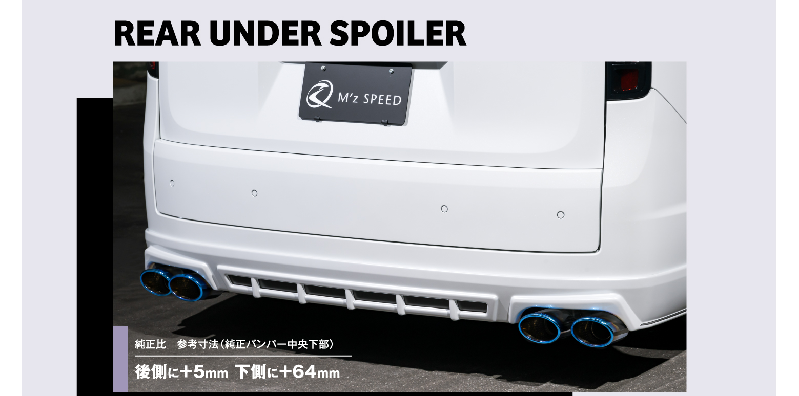 フラップデザインを効果的に活用するアプローチ。 EXCLUSIVE ZEUS GRACE LINE STEP WGN SPADA 新型ステップワゴンの最大の特徴である、ボクシースタイル。このアイデンティティを最大限にいかす方向性で構築したのが今作のグレースラインのエアロプログラム。ボトムまわりにエッヂの効いたフラップデザインを活用することでスクエアなボディならではのカタマリ感と、スポーティメイクを両立。とはいえ、過度な主張ではなく、さりげないサイズ感にしたことでけっして奇をてらうことなく、あくまで自然なフィット感を獲得。こうした控えめなアプローチこそが、オトナなカスタムでは重要なポイント。それでいて、しっかりと存在感のあるスポーティシルエットが完成しました。 FRONT HALF SPOILER 純正比 参考寸法(純正バンパー中央下部)前側に+15mm 下側に+77mm ボクシーシルエットに呼応するようにスクエアなデザインを採用するフロントハーフスポイラー。このようにボディと同調しながらも、ボトム部分のフラップ形状でスポーティな印象を獲得できるデザイン構成です。/ デモカーのようにフラップの天面を塗り分けすれば、さらにフラップの存在感をアピールできます。/ 両脇にはLEDデイライトを搭載。最下部に配置されるため、視覚的なローダウン効果も得られます。 SIDE STEP 純正比 参考寸法(純正サイドジャッキアップポイント)下側に+33mm / サイドステップの後端にはダクト風のプレスを設定。また、ステップの最下部にもフラップデザインを採用し、デザイン全体の連動性を高めます。 REAR UNDER SPOILER 純正比 参考寸法(純正バンパー中央下部)後側に+5mm 下側に+64mm 中央部分にはフィンを通したディフューザーデザインを採用。さらに塗り分けることで、ストロボラインのようなスポーティな仕上がりに。 / 両サイドのボトム部分は、やはりフラップ形状に。フロント、サイドと同様に天面を塗り分けて、存在感を示します。 FRONT GRILLE GARNISH 純正の雰囲気をトレースした、マークレス化を図ったフロントグリルガーニッシュ。プレーンなデザインとしたことで悪目立ちしない、オトナなルックです。AES製品となるため未塗装での装着が可能で、デモカー装着の【シボ加工艶消しブラック】もしくは【カーボン柄ブラック】からチョイスできます。 REAR FENDER MALL リアにのみ設定するフェンダーモールは、7mm幅なので車検対応品。リアホイールの出面をコントロールするのに重宝するアイテムです。 REAR GATE SPOILER 無機質な印象のリアゲートまわりをスタイリッシュにメイクしてくれる、リアゲートスポイラー。ABS製品とAES製品を設定しており、コストパフォーマンス狙いならば未塗装での装着が可能なAES製がオススメ。デモカー装着の【シボ加工艶消しブラック】または【カーボン柄ブラック】から選択可能です。 PILLAR PANEL スポーティに映えるカーボン柄を採用した、ピラーパネル。両面テープで貼るだけのお手軽感も魅力です。 DOOR MIRROR COVER 天面に3本フィンが走るドアミラーカバーは、エムズスピードの定番人気アイテム。純正ミラーに被せるだけで、イッ気にスポーティ見えするスグレモノです。 EXHAUST SYSTEM エキゾーストシステムは、左右4本出しのアグレッシブなデザイン。デモカー装着のスポーツ度の高いチタンカラーテールに加えて、プレーンな印象のステンレステールからチョイスできます。 STEP WGN SPADA FRONT IMAGE STEP WGN SPADA REAR IMAGE WHEEL Julia Balian ⒻⓇ19×7.5J 50(ⒻⓇ225/35-19)※ⒻⓇ20mmスペーサー装着 / 時計のベゼルをデザインモチーフとした、斬新ルックのジュリア・バリアン。デモカーには19インチをインストールしました。 気をてらわずシルエットの同調こそが、エアロの正義。 STEP WGN SPADA REAR LEFT SIDE IMAGE